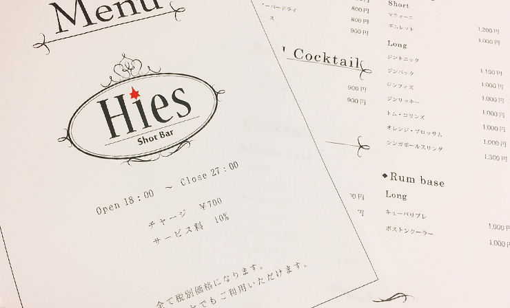 Shot Bar Hiesではカクテル、ウイスキー、ブランデー、ビール、ワインなどをご用意しております。